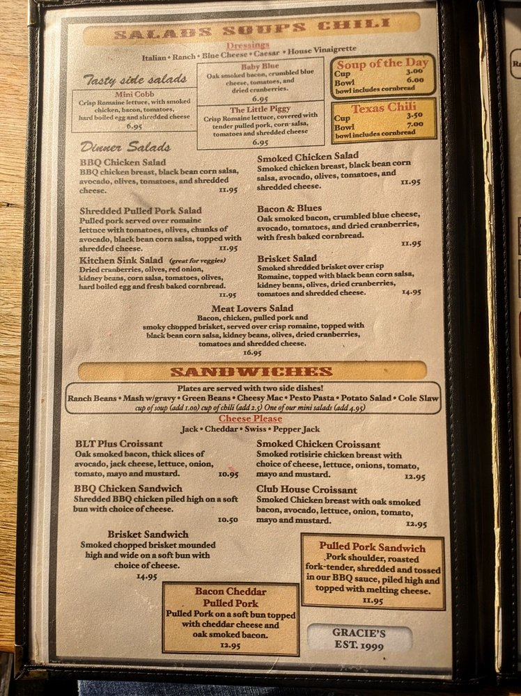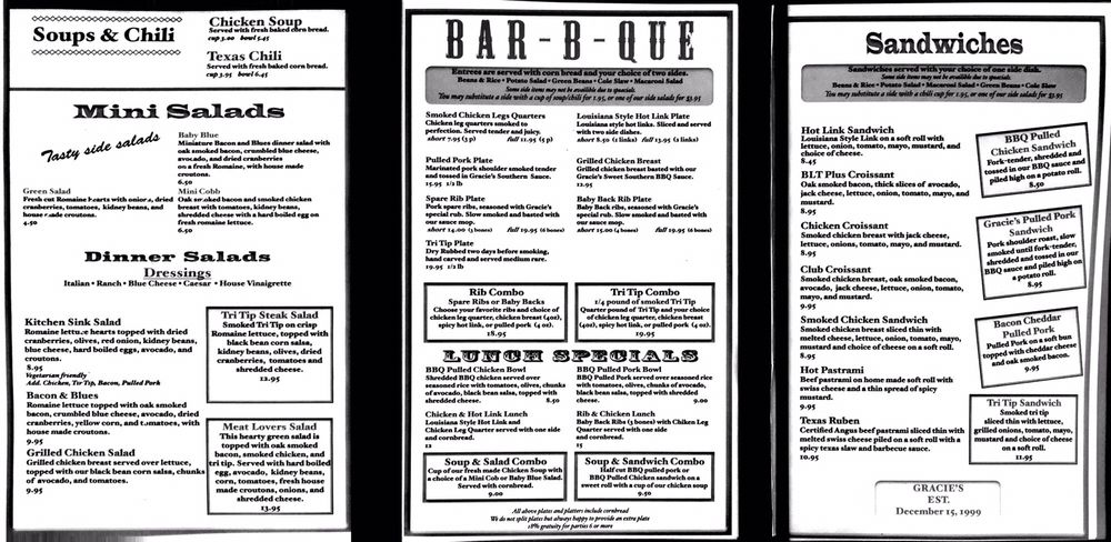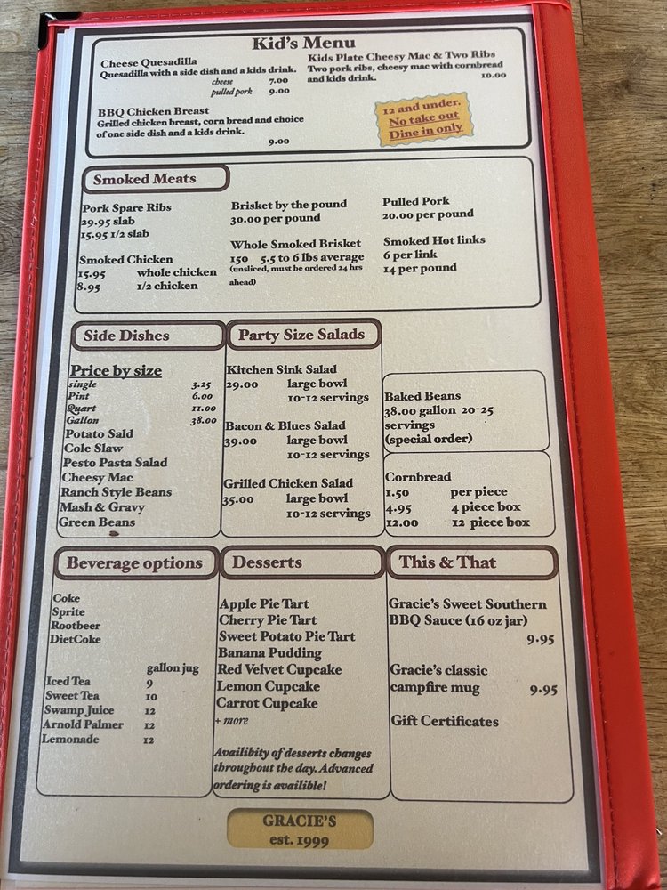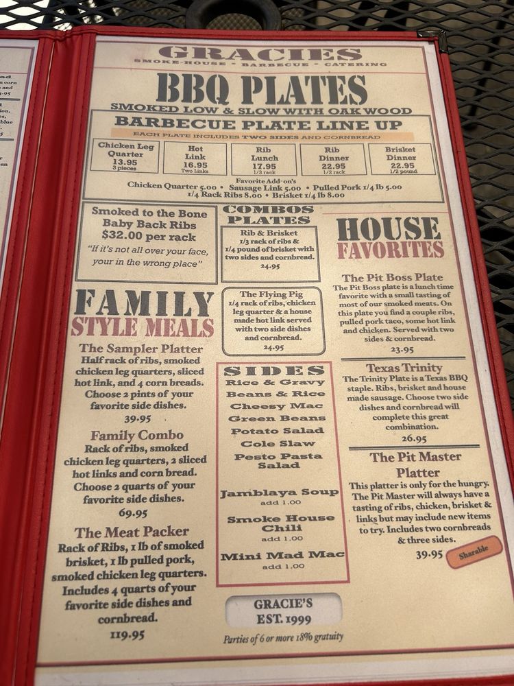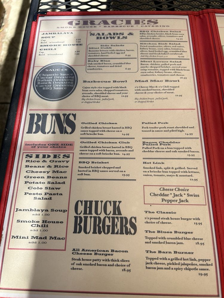 Gracie’s in Vallejo offers a diverse menu with standout items like the BBQ Chicken Salad, Kitchen Sink Salad, and the popular sandwiches like the Grilled Chicken Club and Smoked Chicken Sandwich. Customers rave about the quality of the food, especially the ribs and brisket. The atmosphere is welcoming, with friendly staff and a quick service. The housemade lemonade and ice tea served in giant mason jars are a hit, as are the delicious sides like garlic roasted green beans and jambalaya. Gracie’s is a hidden gem for barbecue lovers, with a mouthwatering aroma of smoked meats that sets the stage for a delightful dining experience. The outdoor seating area adds to the overall charm, making it a perfect spot for enjoying a meal with friends or family. Overall, Gracie’s is a must-visit for those craving delicious barbecue in Vallejo.