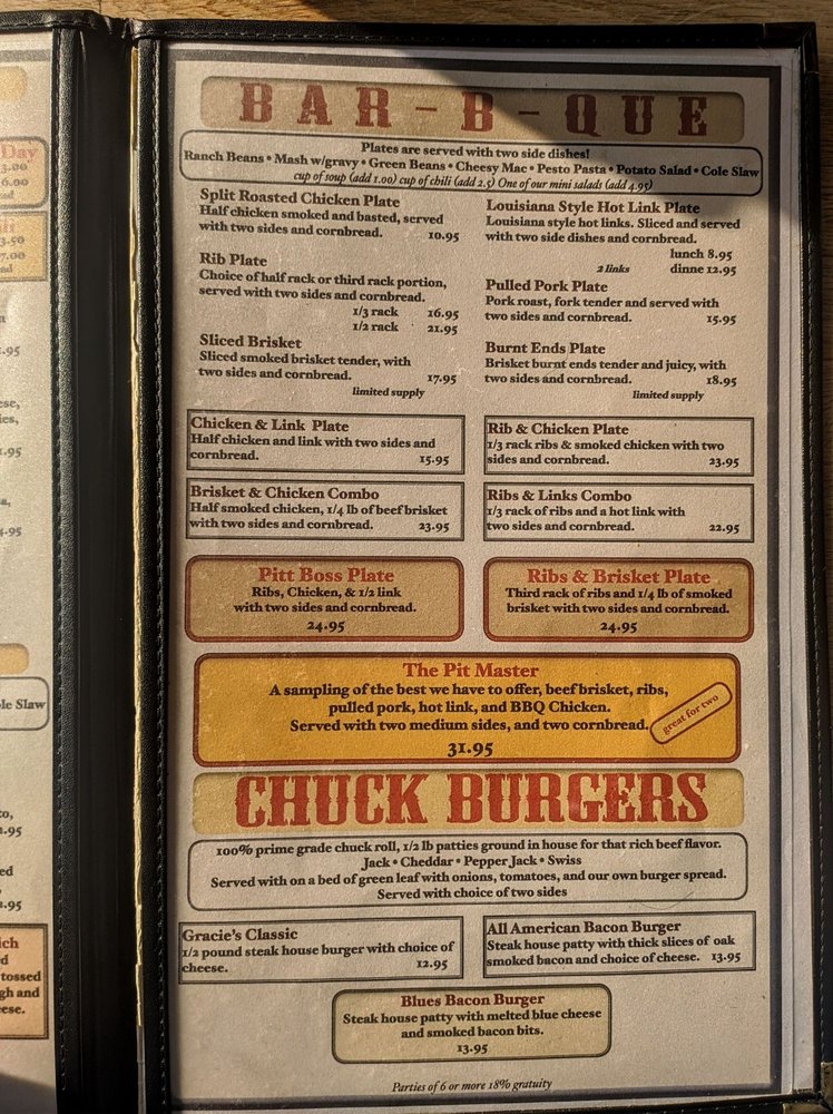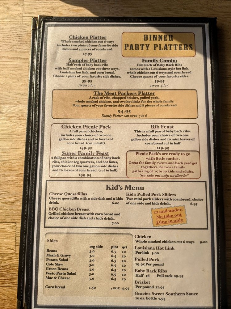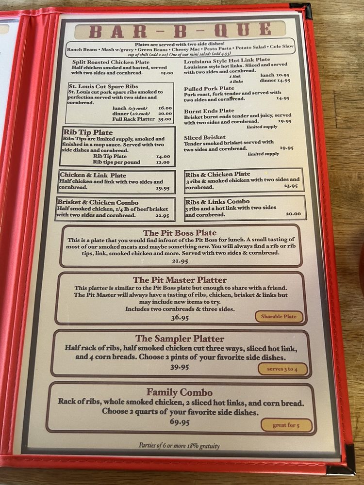 Serves 2 to 3. Half rack of baby back ribs, 3 pieces of chicken, Louisiana hotlink, and cornbread. Choose 2 pints of your favorite side dishes.