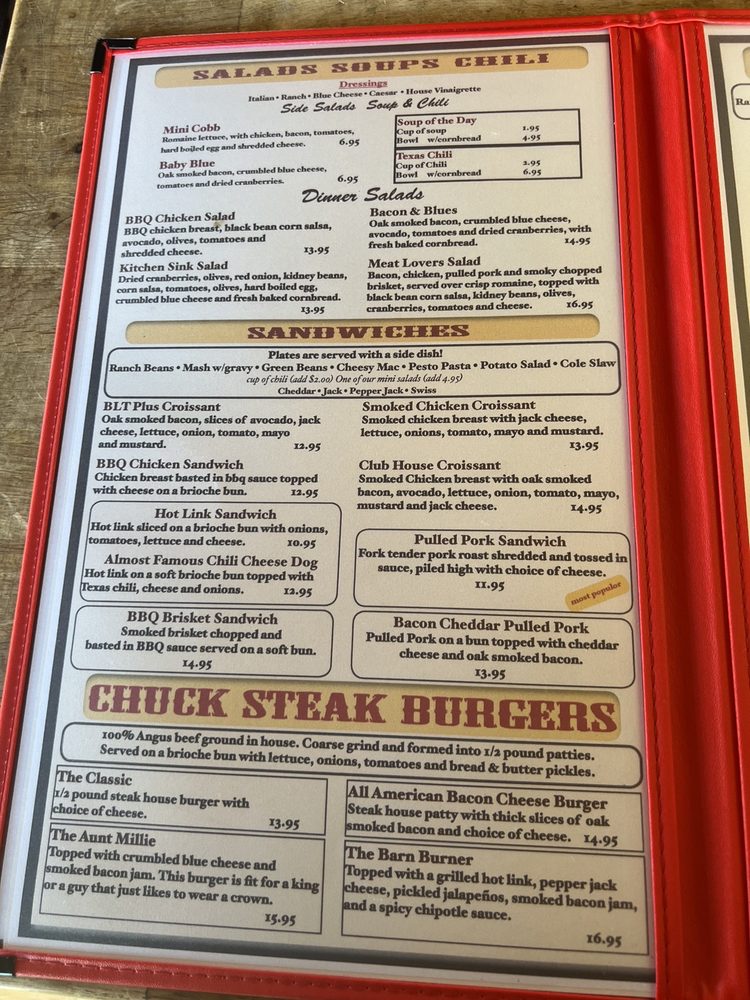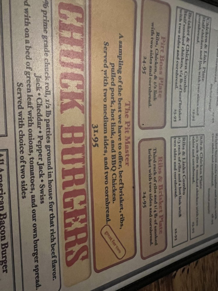 3 pieces of chicken, 1/4 lb. of beef brisket with 2 sides and cornbread.